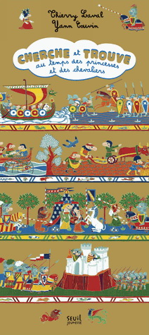 Une couverture en or (hé oui!) pour ce Cherche et trouve très moyenâgeux. Continuant l’exploration des grandes périodes historiques (après les pharaons), les auteurs nous emmènent à la découverte du monde médiéval, de ses princesses et ses chevaliers, mais aussi de ses lépreux, baudriers, dague, moine, donjon, serpe, chaumière, lavoir, forgeron, baquet, araire et autres nourrices… En 5 tableaux : l’invasion des vikings, dans les champs, la vie à l’intérieur des remparts, le siège, la fête au château.