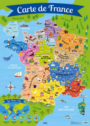 Ce poster présente la carte de France. La France est divisée en régions, mises en avant par des couleurs différentes. Chaque région est divisée en départements, chacun portant son numéro et étant également illustré par un élément typique (personnage, gastronomie, animal, monument, activité, architecture...). Les pays frontaliers sont signalés pour que l' enfant situe correctement la France. Enfin, une illustration en bas de poster propose la carte du monde pour repérer les différents départements, régions et territoires d Outre-Mer.