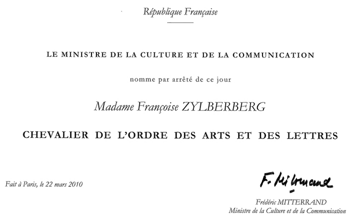 Françoise Zylberberga reçu, dimanche 28 mars 2010 l’insigne de Chevalier